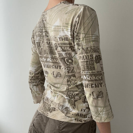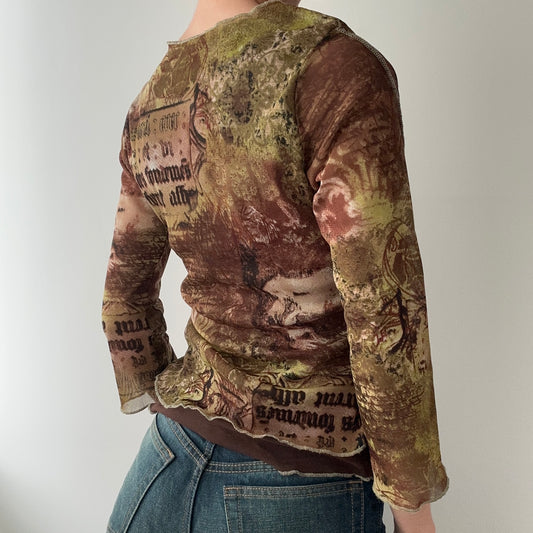 Graphic Khaki and Brown Mesh Top With 3/4 Sleeves (XS)