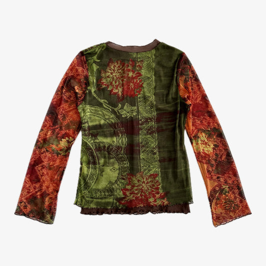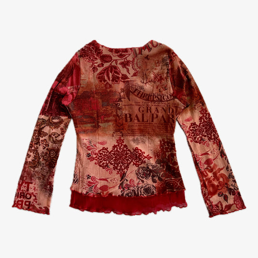 Graphic Venetian Red Double Layered Mesh Long Sleeve Top (S)